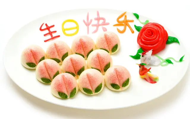 中国ではお祝いの席に欠かせない伝統の「桃まんじゅう」。中国語で「誕生日おめでとう」の飾り桃まんじゅうと一緒に、記念写真をサービスしています。