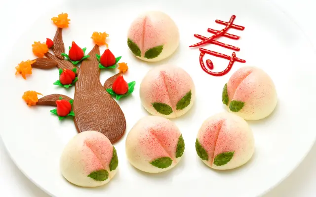 中国では古来より「長寿」と「幸福」の象徴とされる桃をかたどった縁起物です。ふっくらと蒸しあげたまんじゅうに、お祝いの気持ちを込めてご用意いたしました。